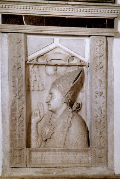 [5] Creato il 16 giugno 1451 (HIERARCHIA CATHOLICA, voce Pietro Barbo, vol. II, p. 267). Con quattro fiocchi allora era indicato il rango di cardinale, vedi lo stemma Barbo incorniciato dalla berretta e i quattro fiocchi, nella medaglia coniata nel 1455, in occasione della fondazione di Palazzo di San Marco quando era, appunto, cardinale. (R. WEISS, Un umanista veneziano Papa Paolo II, Venezia 1958, p. 50, e lo stemma con iscrizione sulla facciata di Palazzo di San Marco sempre del 1455; F. GLIGORA - B. CATANZARO, Storia dei Papi da s. Pietro a Giovanni Paolo II, Noventa Padovana 1991, vol. II, pp. 715-718.