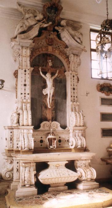 L'altare del Crocefisso, addossato alla parete che separa la sacrestia dal grande cortile quadrato della villa, si distingue dagli altri per la ridondante fattura a volute, riccamente tempestate di pietre preziose, incastonate con geometrico disegno sulle bianche superfici dei marmi. La fantasia dell'artista si libera fra volute e le rare linee rette della mensa e dei pilastrini che affiancano la pala del crocefisso. In tutta libertà sovrappone uno su l'altro i moduli ritorti e scanalati, segmentati in scaglie levigate dall'andamento mosso della linea curva, sino al grande scudo che lambisce il soffitto.
