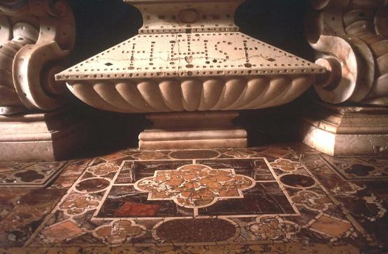 La bianca figura del Cristo, che spicca al centro della pala, diviene allora occasione per un ottimo esercizio di insolite sperimentazioni formali e cromatiche ad effetto: le policrome macchie delle numerose corniole, agate e diaspri[1], il ricco e sovrabbondante fastigio alzato sino al soffitto, con il grande scudo su cui si legge: