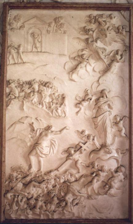 Un Dio severo, centro motore dell'opera, nel suo imperscrutabile disegno, muove dall'alto i protagonisti della redenzione umana, brandendo nella mano destra alzata, un arco.