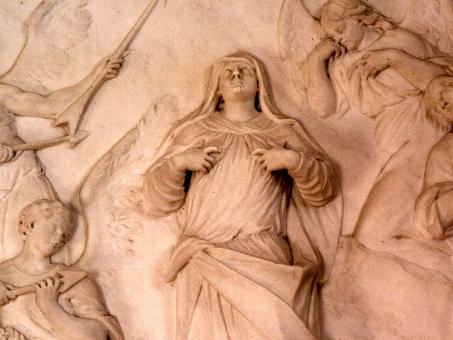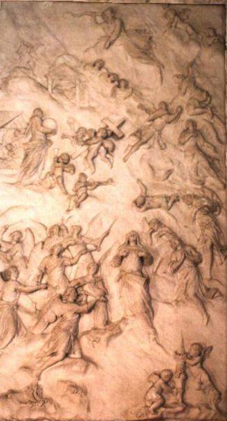 Pur essendo di più difficile lettura al confronto con quella dell'Immacolata, anche questa pala è eseguita dal Torretti mantenendo fede all'idea di tessere nella luce i lievissimi rilievi tematici. Trasparenti e diafane le immagini modellate si celano nel biancore levigato delle superfici, appena mosse dalla schiera compatta dei sette angeli o dalla foga disordinata dei cherubini che vorticano al cielo.